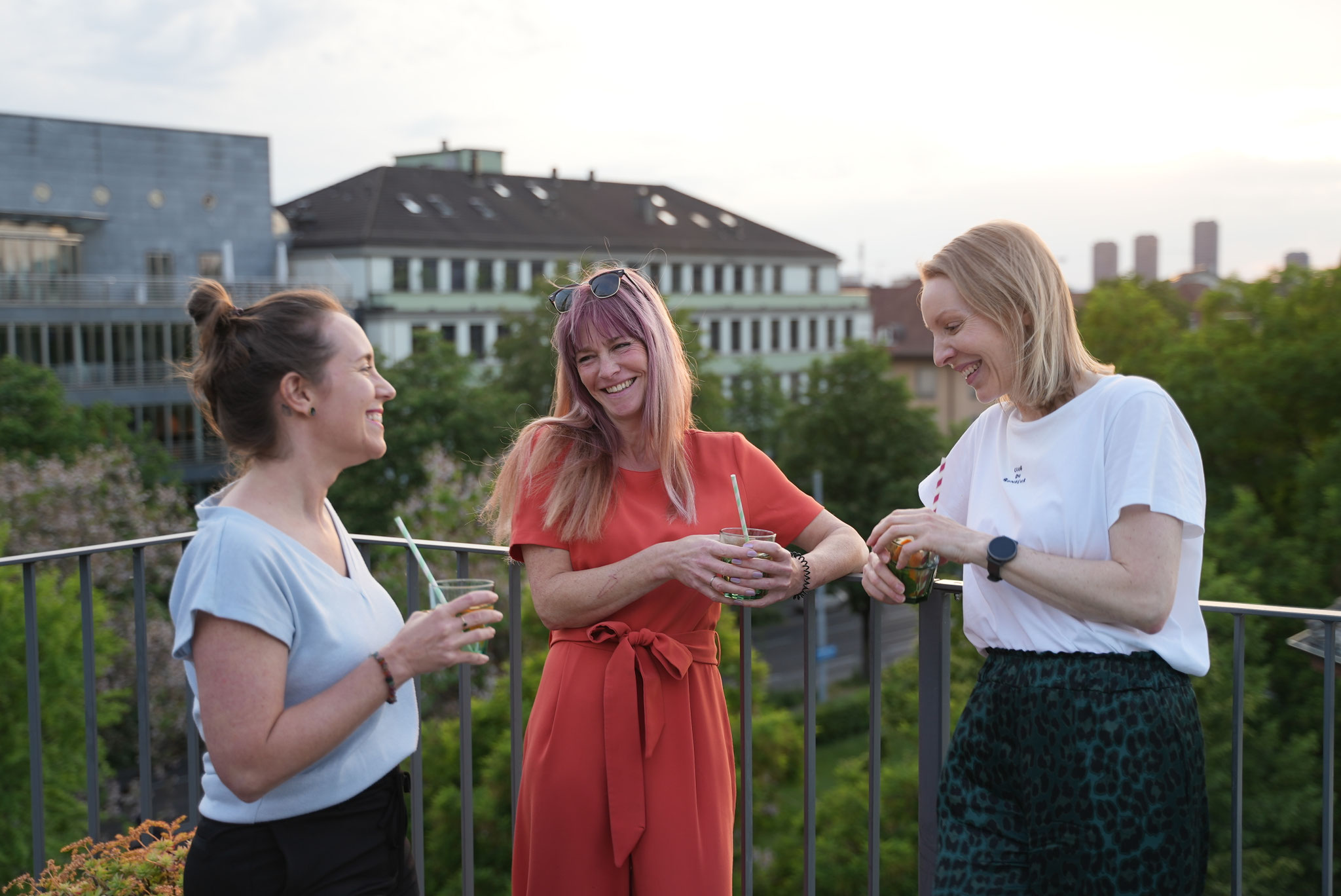 Die grosse Dachterrasse bietet Sicht über den Stauffacher bis hoch zum Üetliberg. Hier kann man sich die Luft um die Nase wehen lassen und im Sommer auf den Liegen die Sonne geniessen.