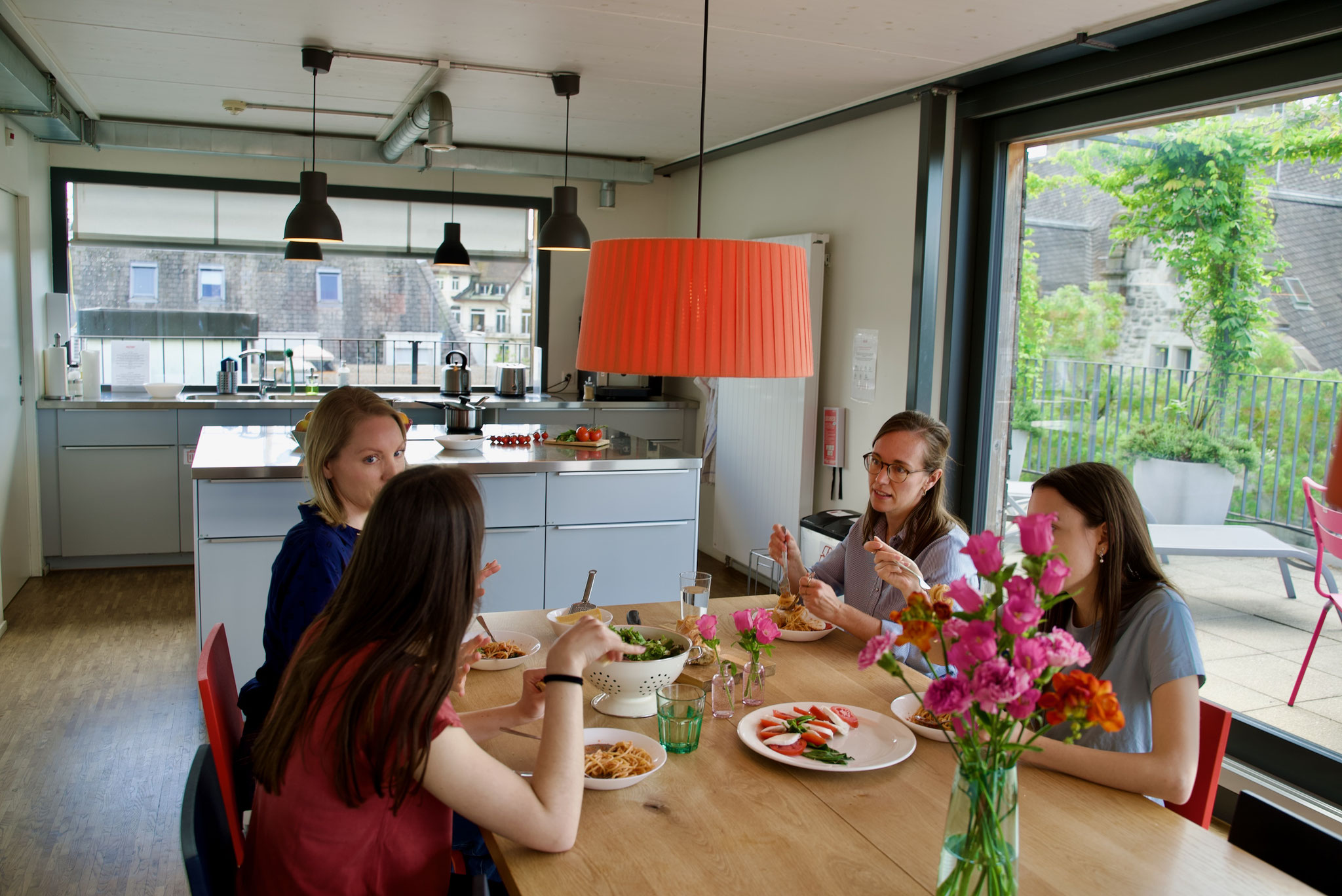 Im klimatisierten Attikageschoss finden Josephine’s Gäste ihre Küche und ihr Ess- und Wohnzimmer. Grosszügig, hell und mit allem ausgestattet, was man braucht, um sich kulinarisch nach eigenem Gusto einzurichten: Töpfe, Pfannen, Geschirr, Besteck, Kochutensilien... Es stehen ein grosser Induktionsherd, ein Backofen, eine Mikrowelle und diverse Küchengeräte zur Verfügung. Der Kaffee-Vollautomat braut neben Kaffee auch Cappuccino und Co - während des Frühstücks gratis.